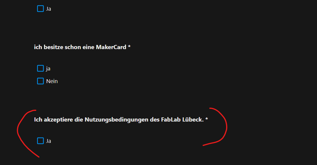 Es ist ein Fehler beim Übermitteln des Formulars aufgetreten: Question "Ich akzeptiere die Nutzungsbedingungen des FabLab Lübeck. " is required.